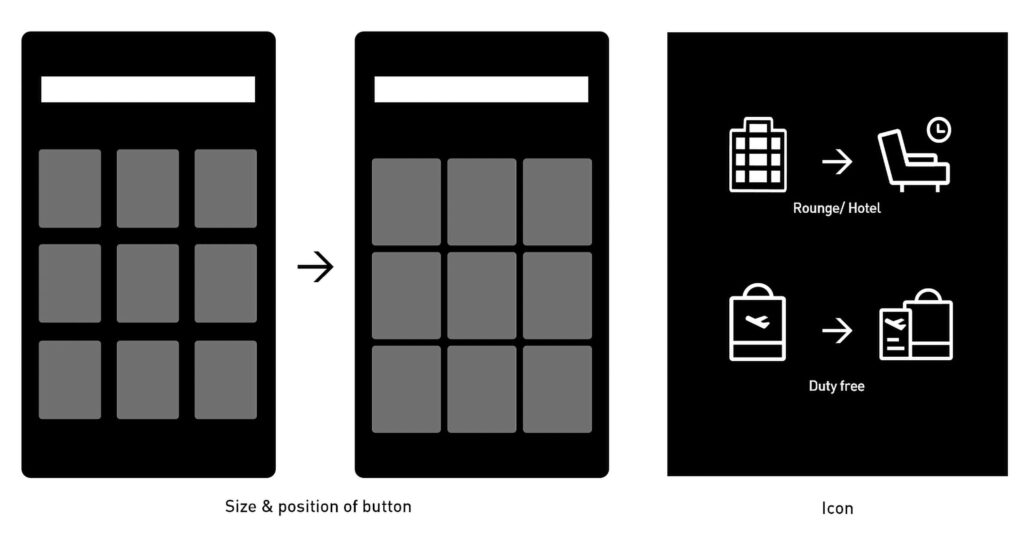 We conducted the low-fidelity test through a pilot operation for one month at the airport. After the test, we improved the details of design overall. Especially, buttons became more bigger and texts are written more simple as possible as we could.