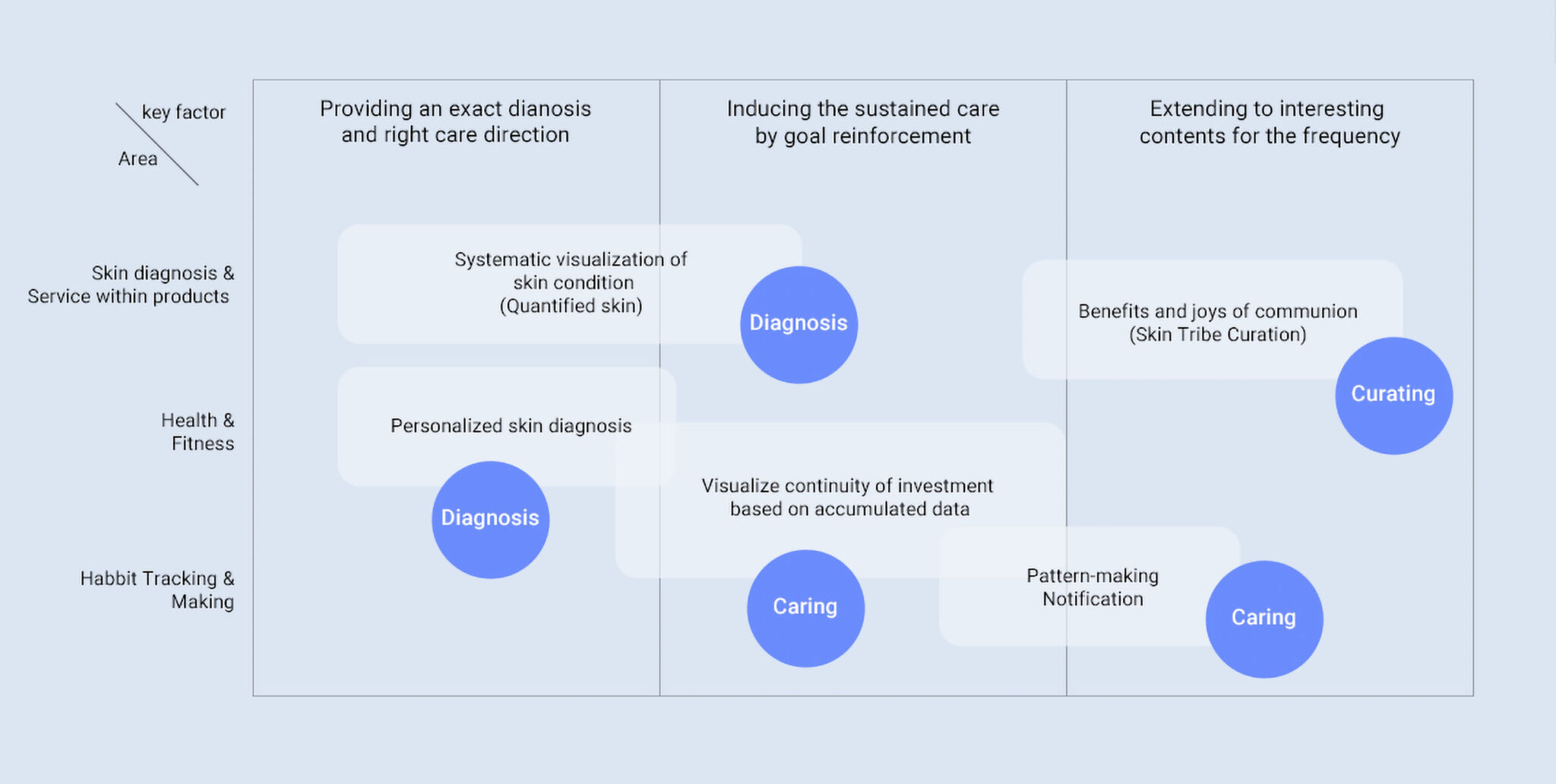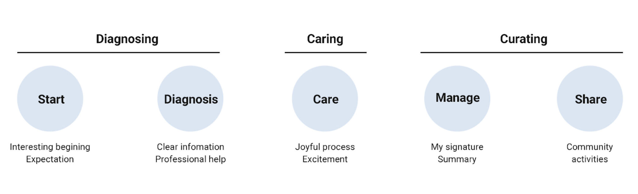 We identified important cues that shaped the experience design. Skincare generally follows a structured sequence, and even when people use at-home devices, they want an experience that feels similar to a professional clinic. Based on this, we divided the skincare journey into three steps: Diagnosis, Care, and Curation, each aligned with the device’s core functions.