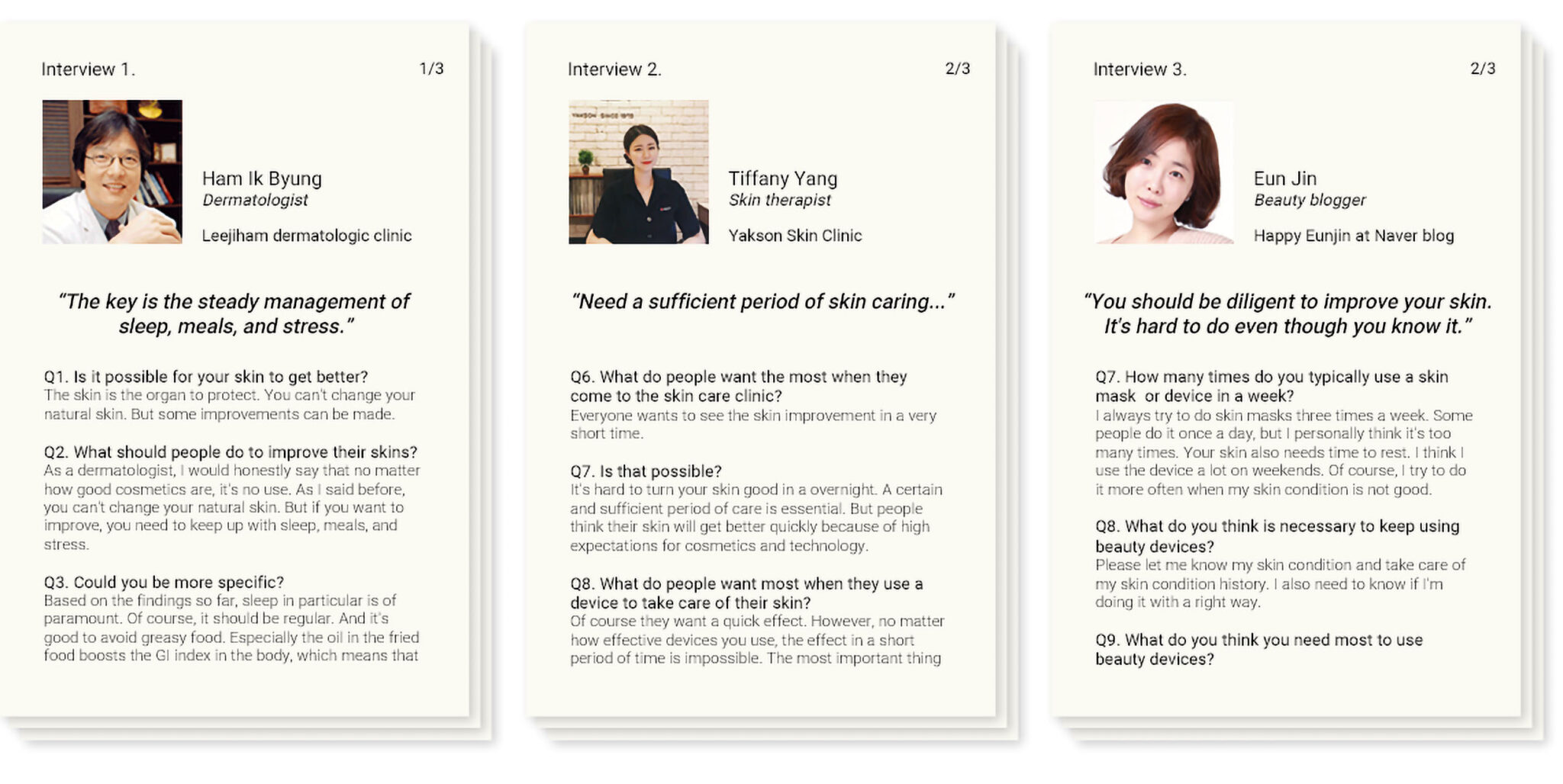 Our research team conducted interviews with experts including a dermatologist, a skin care specialist, and a professional beauty blogger. Through these discussions, we identified valuable keywords and essential requirements for effective self skin care, which helped guide our design direction